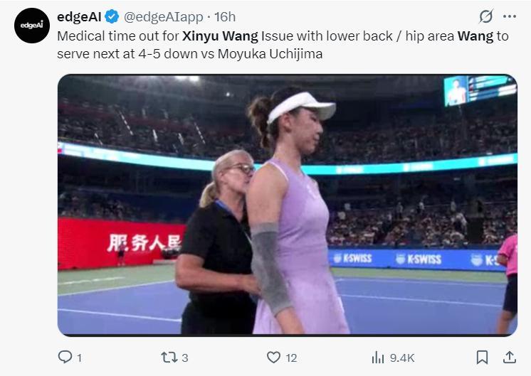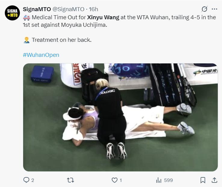 醫療工作人員爲王欣瑜進行了冰敷與噴霧止痛治療,隨後王欣瑜重返賽場,只可惜她還是沒能拿下第二盤扳平大比分,她就這樣被資格賽選手橫掃出局了。