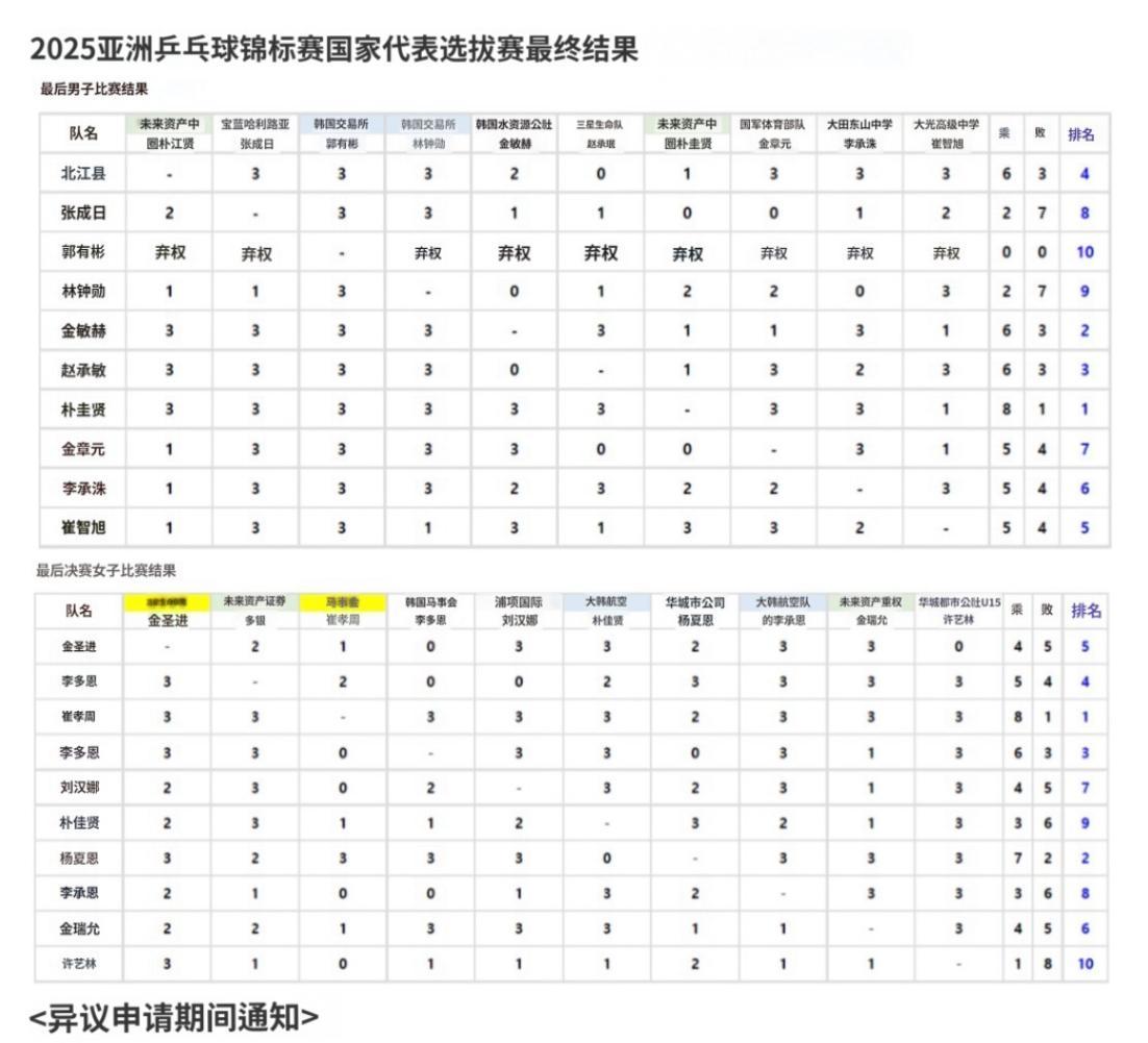 女團這邊崔孝珠、梁夏銀兩人是通過選拔賽確定亞錦賽名額,崔孝珠拿到8勝1負,梁夏銀拿到7勝2負,這兩人以第一、第二的身份鎖定了亞錦賽名額。