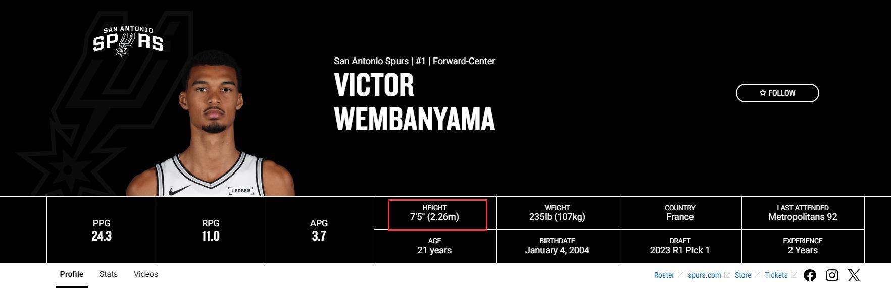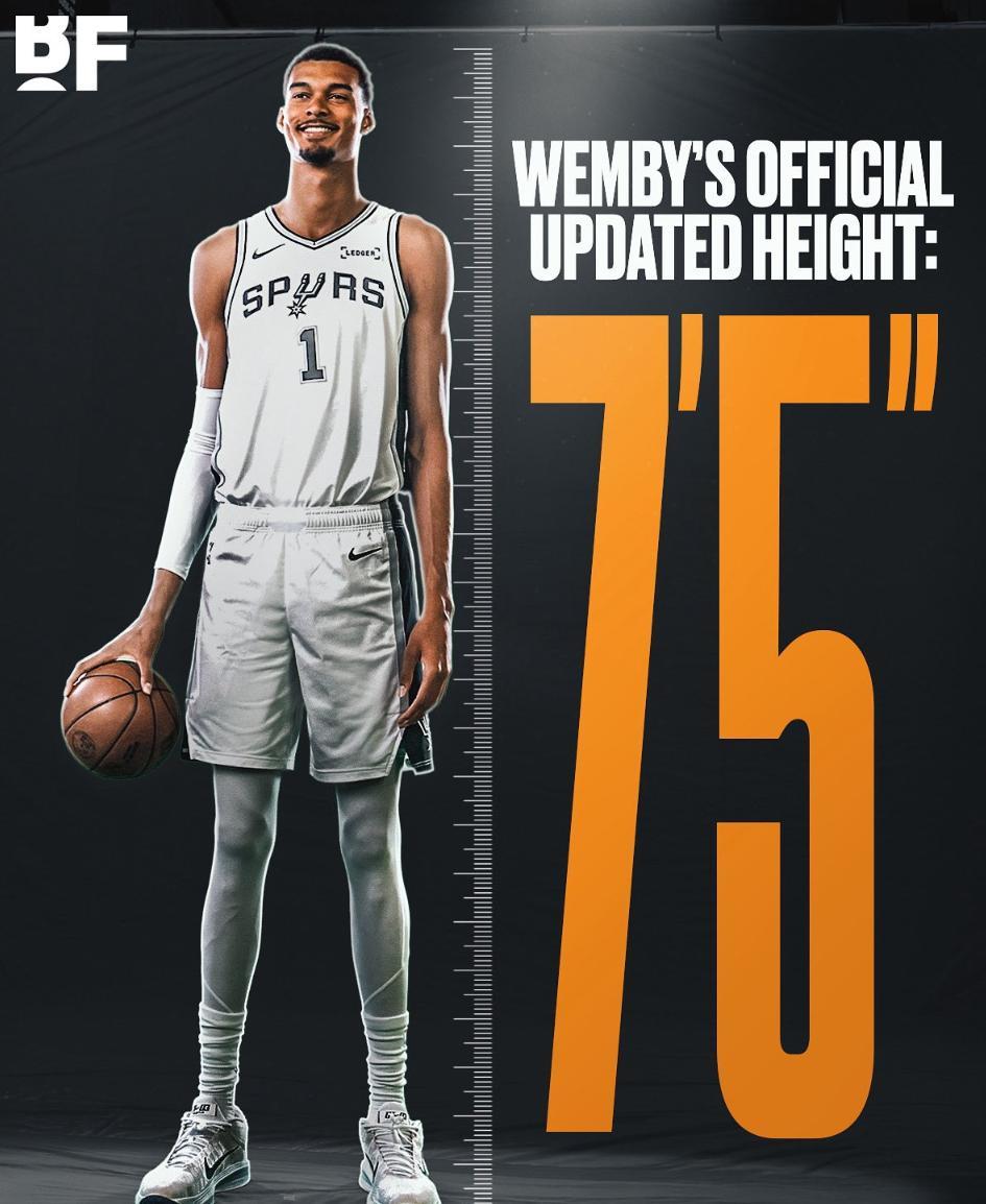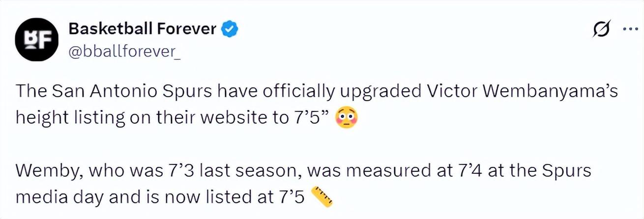 根據美媒BF的消息,馬刺隊官方網站上文班亞馬的身高數據已經更新爲7尺5寸!上賽季文班亞馬的身高是7尺3,在馬刺媒體日的身高測量是7尺4,如今他的身高被更新爲7尺5。(美媒發表了一個目瞪口呆的表情)