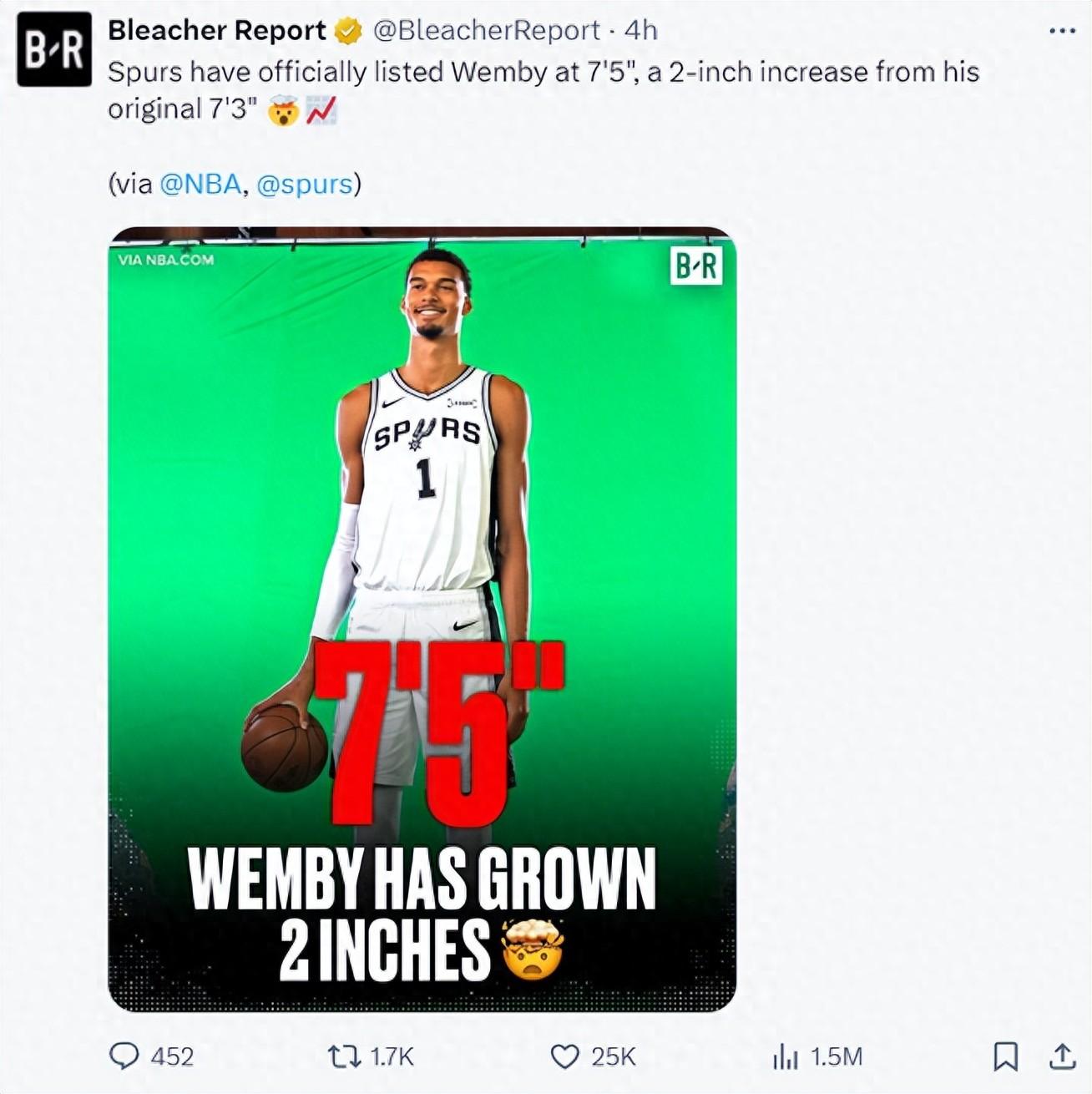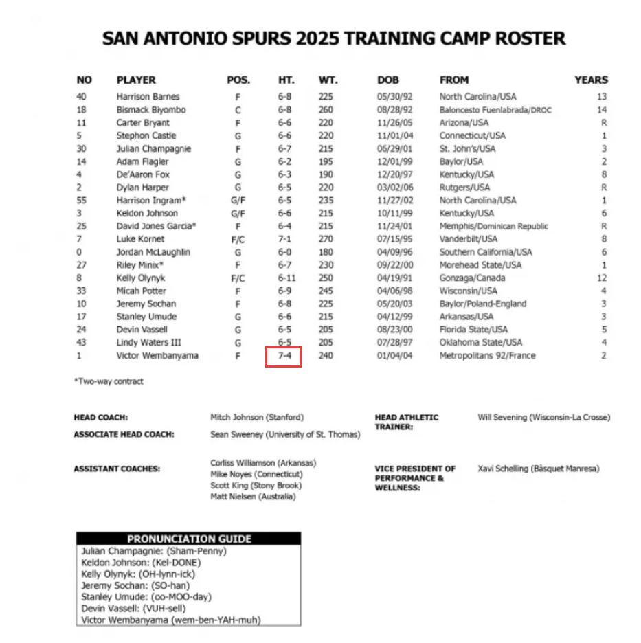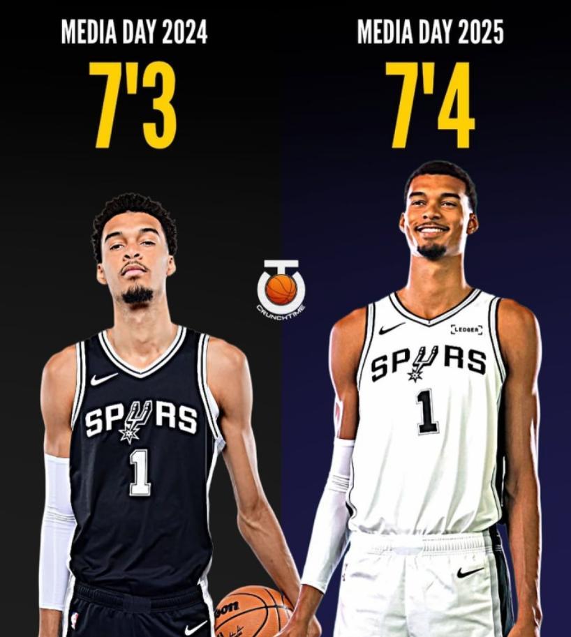就在9天之前,NBA媒體日馬刺隊官方公佈的季前賽名單中,文班亞馬的身高還是7尺4寸,體重240磅,短短9天文班亞馬就從7尺4長到7尺5?9天長了2釐米,這你們覺得可能嗎?