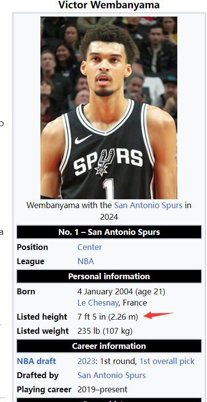 維基百科上文班亞馬的身高數據也已經更新爲7尺5(2.26米),體重爲235磅(107公斤),看起來文班亞馬是真的又長高了。