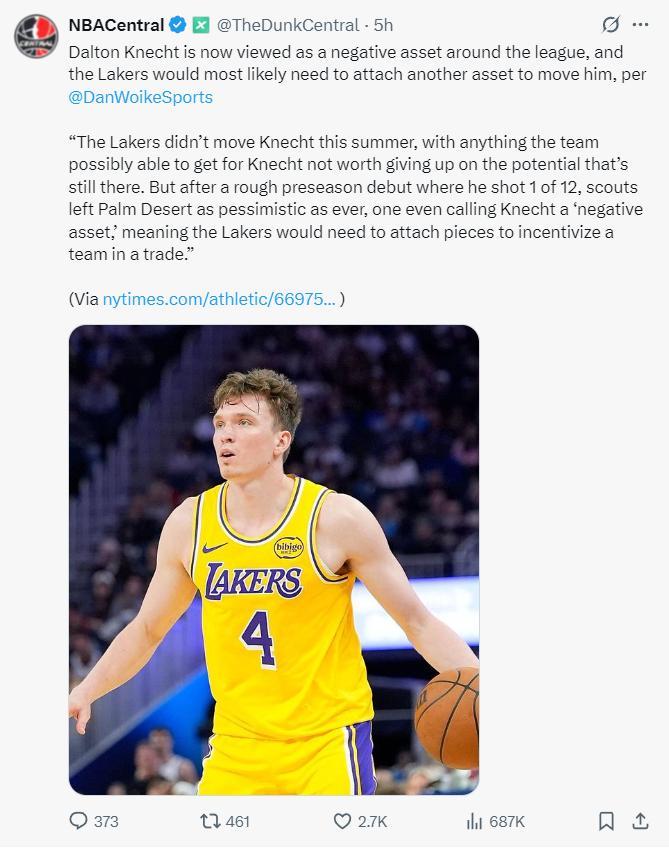 不過這其中存在一個難點,那就是克內克特已經不算是一個優質的資產,根據湖人記者丹沃爾克的報道,外界已經認爲克內克特是一個負資產,如果要交易他需要添加更多資產。湖人今夏沒有交易他就是因爲很多球隊將他看作負資產,加上夏季聯賽、季前賽均發揮不佳,他的交易價值還在走低。