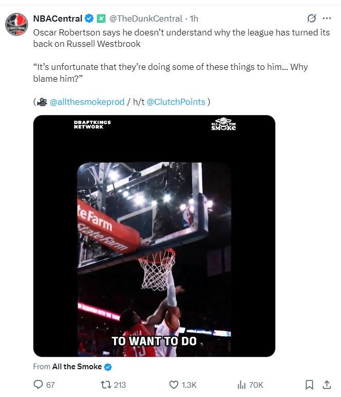 NBA名宿奧斯卡-羅伯特森在參與一檔節目時也力挺威少應該繼續留在NBA打球,大O表示:不明白爲什麼NBA沒有球隊想要簽下威少,很遺憾聯盟對他做出這樣的事,如此出色的他爲何被冷遇,爲何要用一些莫須有的問題來責怪他呢?