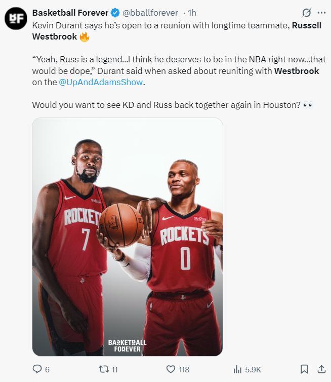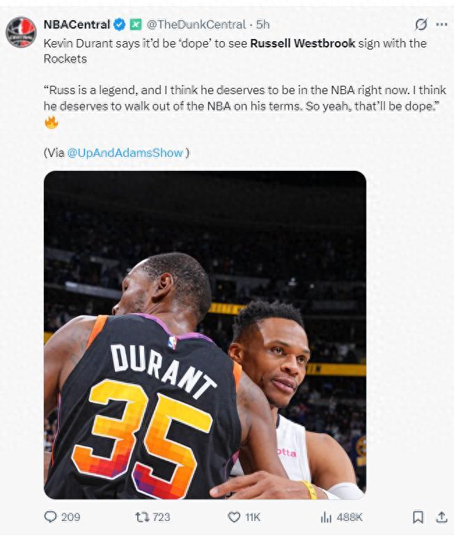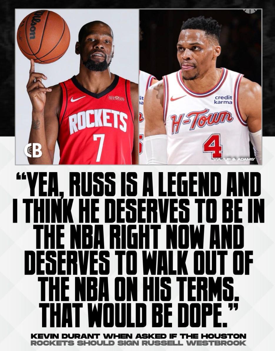 KD的言論至少能證明,他在互聯網上聽到一些消息說威少可能加盟火箭,他自己也願意再度跟威少聯手,而且杜蘭特認爲威少應該由自己來決定是否留在NBA打球或離開NBA,不該是這個聯盟主動拋棄威少。