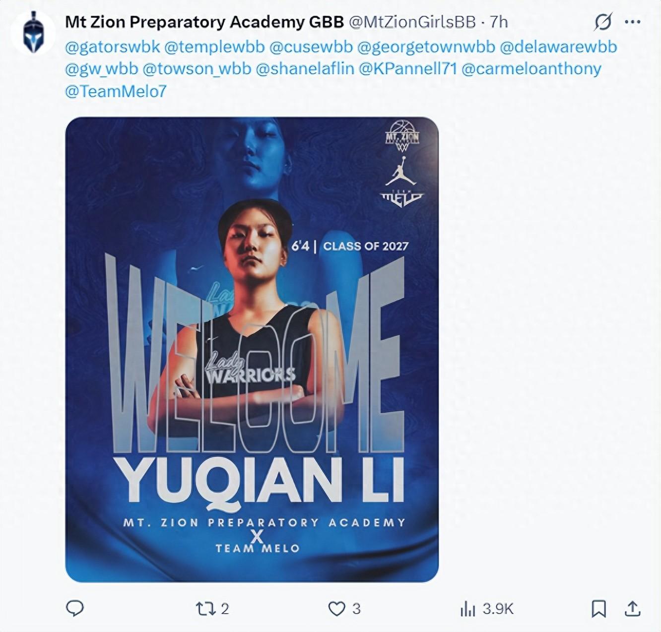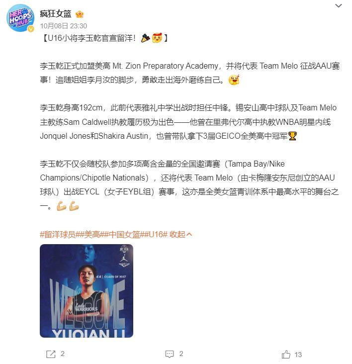 北京時間10月8日晚,據媒體人“NGstar_Pai”消息,中國女籃核心李月汝的妹妹李玉乾將在新學期留洋,她將加盟美高 Mt. Zion Preparatory Academy(錫安山預備學院)新賽季她將代表 Team Melo 征戰AAU賽事。