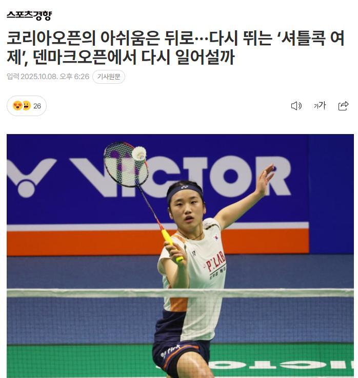 北京時間10月8日,韓國媒體《體育傾向》預熱了世界第一安洗瑩的丹麥公開賽,標題《羽毛球女帝在韓國公開賽折戟後能在丹麥公開賽站起來嗎?》