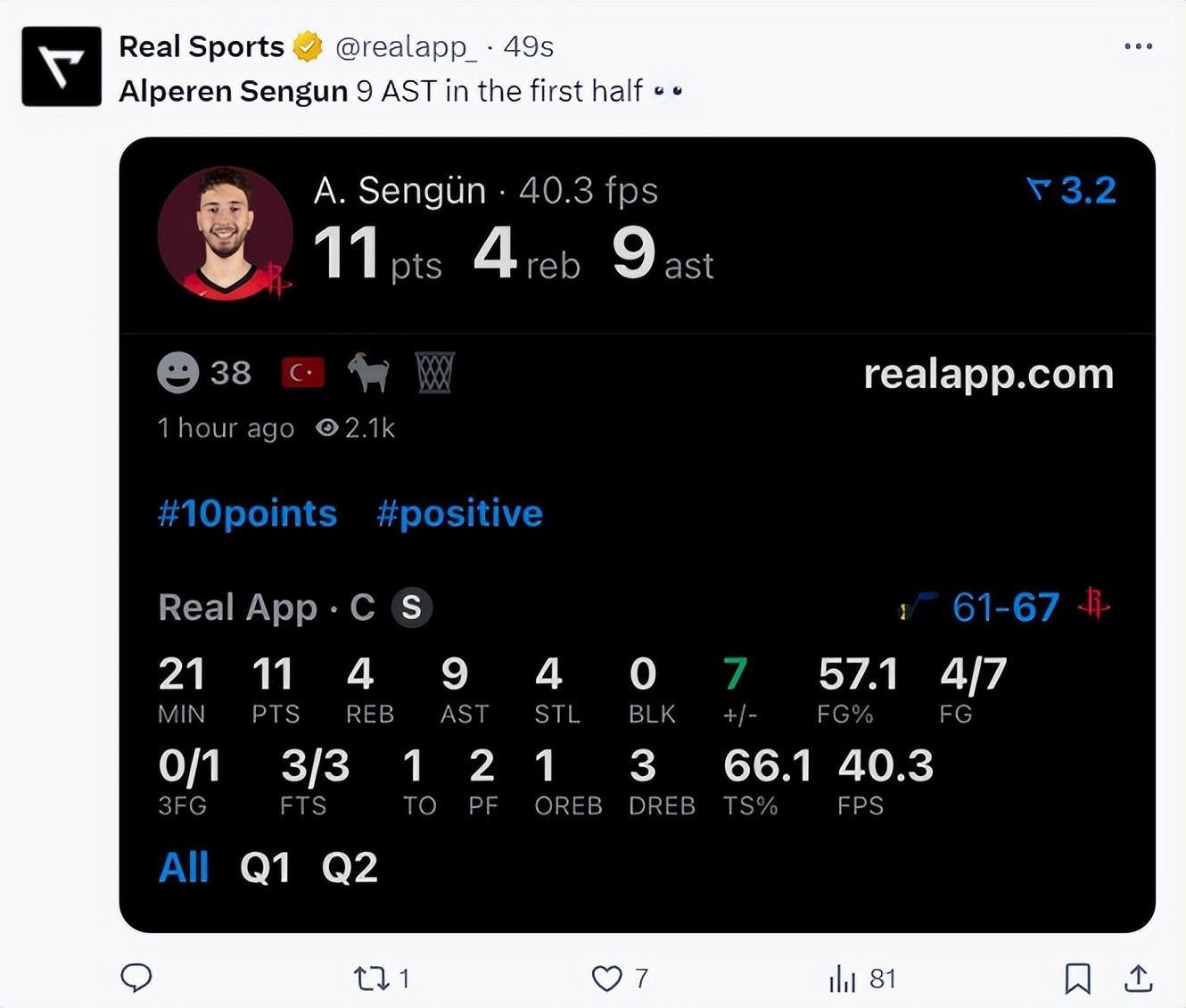 從申京的串聯來看說他就是火箭約基奇都不爲過,阿門、謝潑德的串聯能力都非常有限,球隊的進攻流暢性完全依靠申京,助攻戴維森三分、助攻卡佩拉暴扣、助攻阿門暴扣,次節單節申京6分4籃板7助攻2搶斷攻防一體,半場7中4拿到11分9助攻4籃板4搶斷,申京首秀是19分6助攻5籃板2蓋帽,都太出色了。
