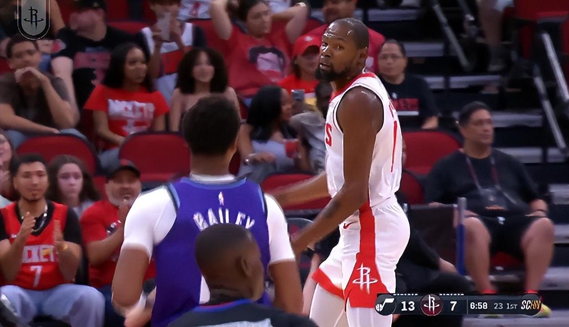 這場比賽是杜蘭特火箭生涯的第一場比賽,37歲的老KD前兩次出手都沒進,第三個中投拿到首分,隨後第四次出手又不中,首節8分鐘,4中1+三分1中0,拿2分1籃板。
