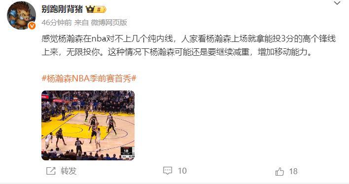 上半場楊瀚森1中0拿0分1籃板1助攻2失誤,媒體人:感覺楊瀚森在NBA對不上幾個純內線,人家看楊瀚森被換下來就讓能投三分的高個上來無限投手,這種情況下楊瀚森需要繼續減重增加移動能力。