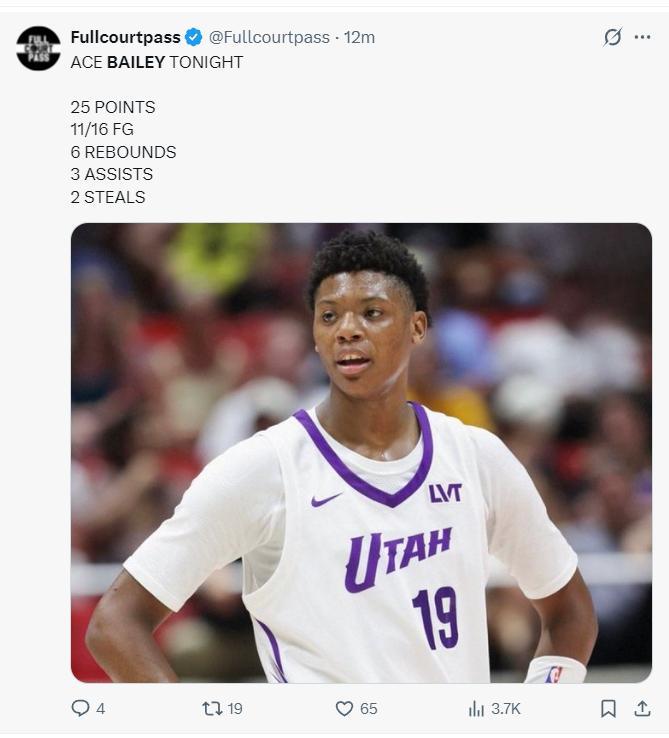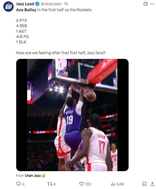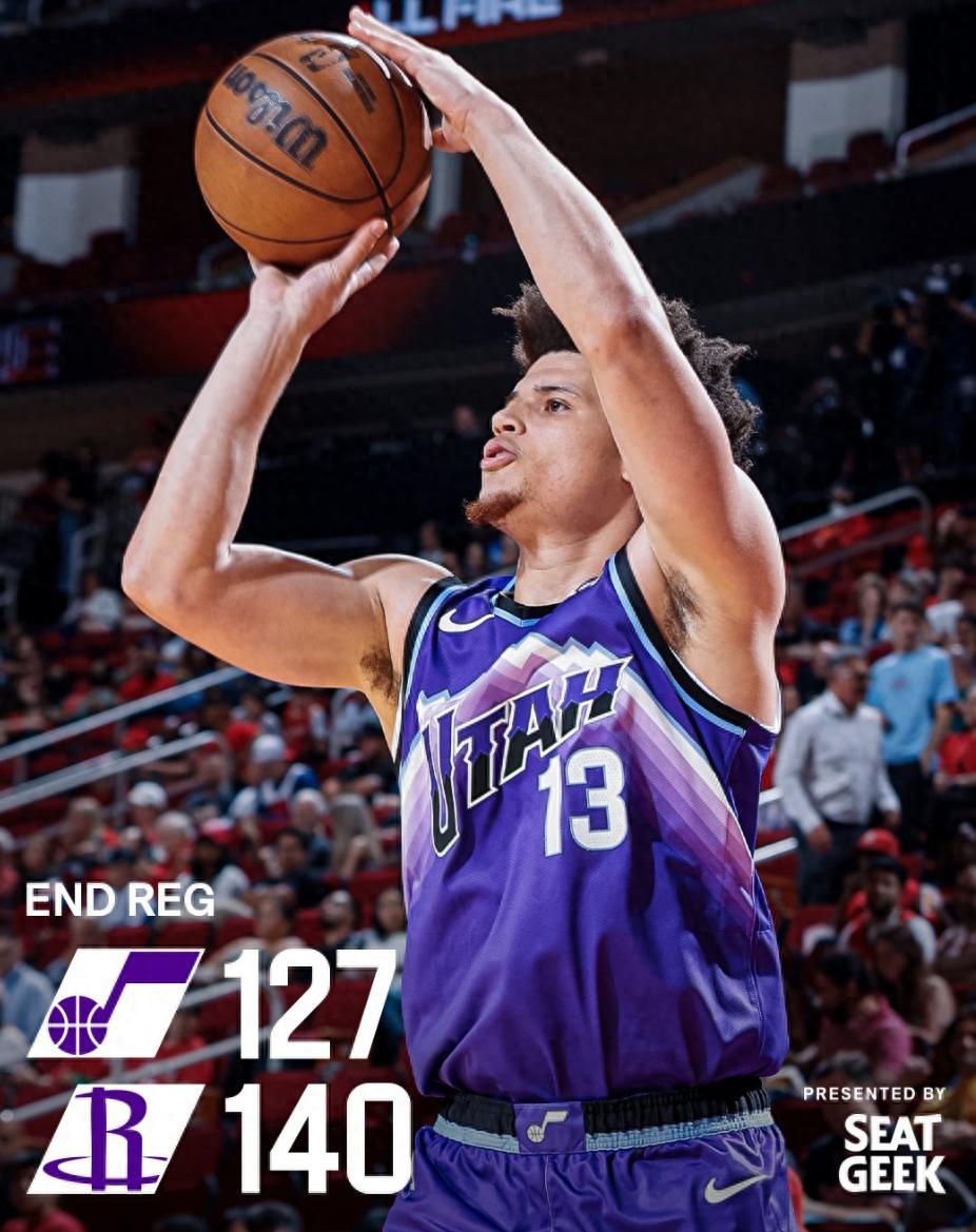 NBA季前賽,爵士127-140不敵火箭,這場比賽爵士不是全主力出戰,馬爾卡寧、凱斯勒、尼昂、菲利波夫斯基、科威都沒打,所以爵士第四節還在用常規輪換,但這場比賽也讓新秀艾斯-貝利有了展示自己的機會,他全場比賽拿到25分。