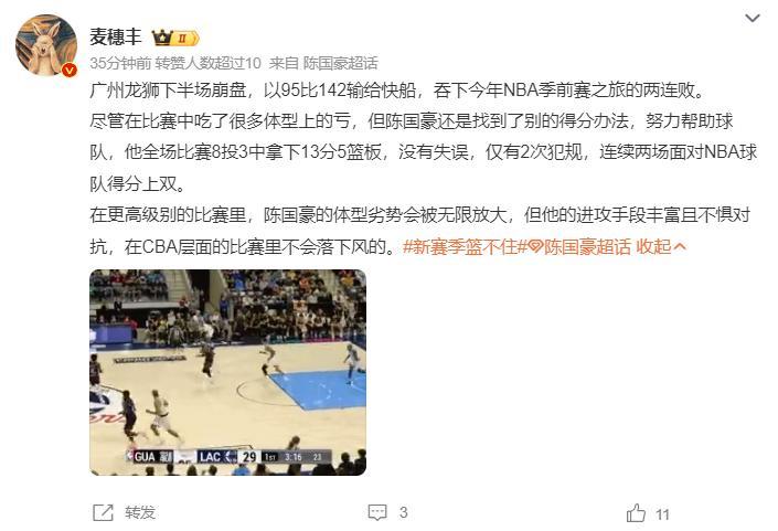 廣東媒體人麥穗豐也評價了陳國豪的第二場季前賽:儘管比賽中體型上很喫虧,但陳國豪總是能想到得分的辦法,努力幫助球隊,連續兩場面對NBA球隊上雙。