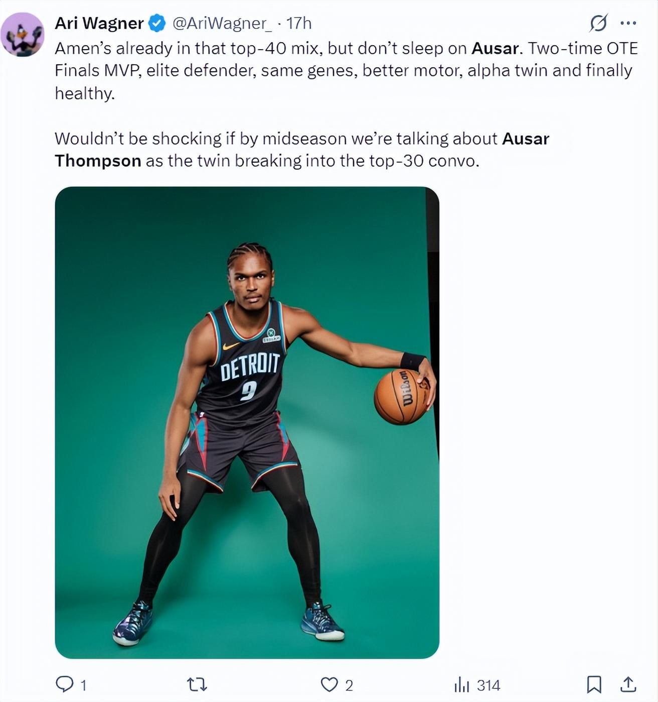 火箭記者Ari Wagner寫道:阿門已經躋身前40強,但不要小看奧薩爾,他曾兩次當選OTE總決賽MVP,一個賽季的OTE常規賽MVP,他也是最頂級的防守球員,他跟阿門擁有同樣的基因、運動能力,如今他已經完全健康,如果進入賽季中期,我們聽到阿門/奧薩爾都進入前30討論不要覺得驚訝。