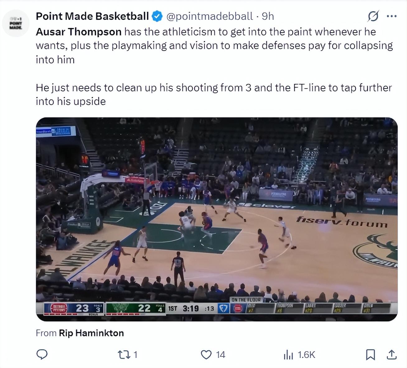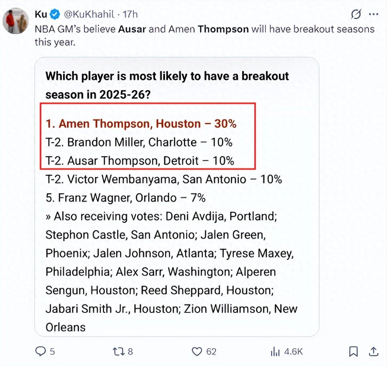 北京時間10月10日,NBA30隊的GM投票給出新賽季:哪位球員在25-26賽季最可能迎來爆發?排名第一的火箭隊的阿門-湯普森,排名第三的是活塞隊的奧薩爾-湯普森。