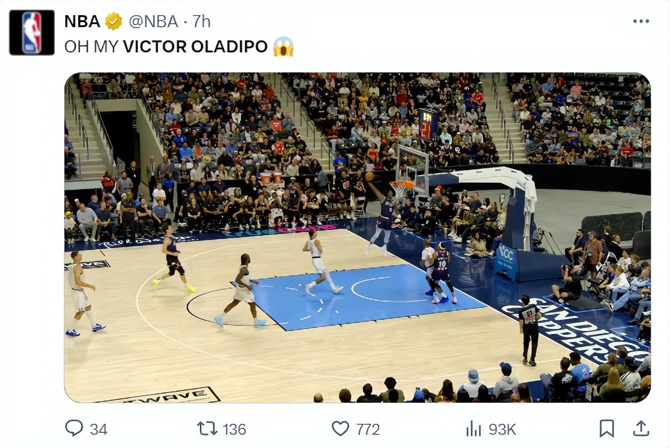 這場比賽奧拉迪波完成了一個單臂空接暴扣,他的頭險些撞到籃筐,NBA官方都寫道:OH MY 奧迪(驚呼表情)。