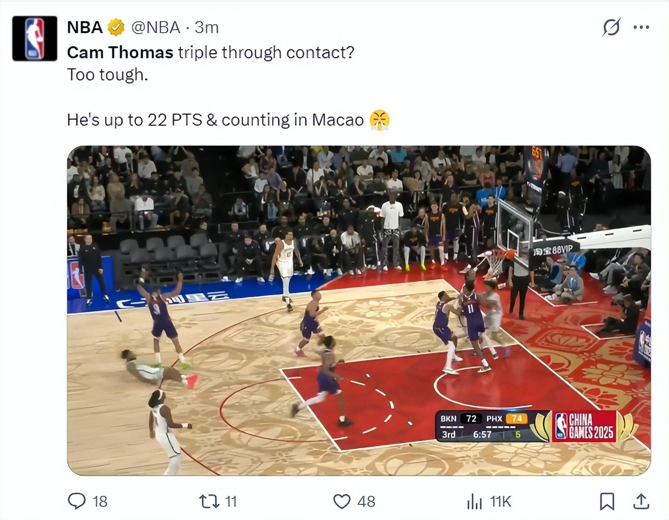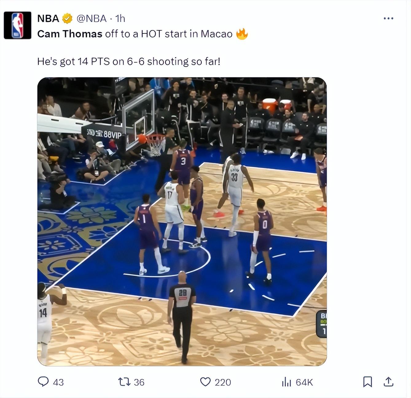 北京時間10月10日,NBA中國賽,籃網VS太陽,這場比賽是中國球員曾凡博的籃網首秀,但主角卻是卡姆-托馬斯,小火車這場比賽開場一波6中6連拿14分引來驚呼連連,三節打卡22分6助攻3籃板十分出彩。