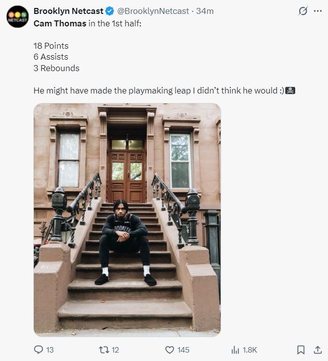 托馬斯首節6中6,三分1中1,罰球1中1拿到14分1籃板1助攻1搶斷,NBA官方都發推爲他打Call,首節他幫助籃網打出39-29的高潮。