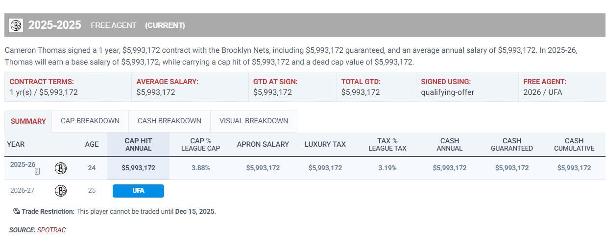 托馬斯今夏只跟籃網簽下了一份一年599萬的資質報價,他一開始是索要均薪3000萬的合同,後來讓步索要均薪2400萬的合同,可籃網總經理肖恩-馬克斯都沒有給,最終托馬斯不得不選擇了資質報價。
