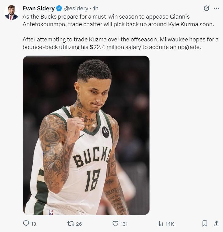 北京時間10月10日,根據NBA記者埃文-斯迪瑞的報道,由於雄鹿隊爲了確保球隊用一場關鍵的勝利來安撫揚尼斯的情緒,關於庫茲馬的交易緋聞會再度興起。