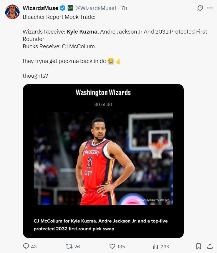 實際上美媒BR最近兩天已經模擬了兩套庫茲馬的交易方案,一套是跟奇才交易,雄鹿送出庫茲馬、安德森-傑克遜、2032年受保護首輪從奇才換到麥科勒姆。