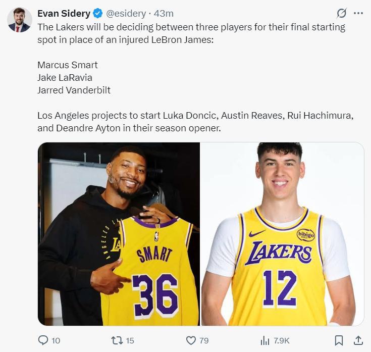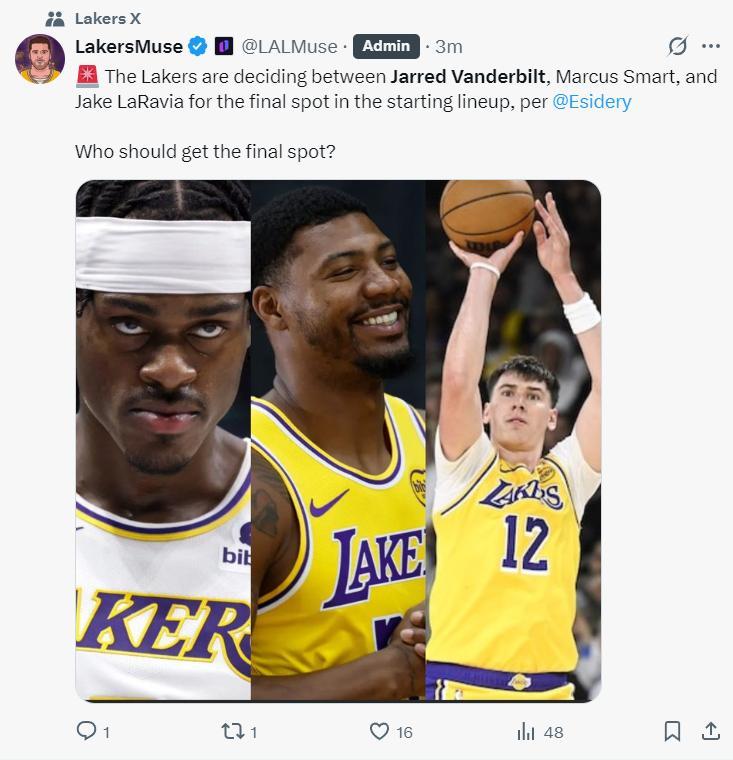 隨後湖人媒體就詢問自家球迷:斯瑪特、拉拉維亞、範德比爾特誰能拿到最後一個先發名額?