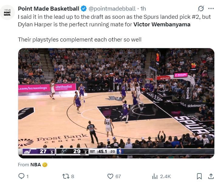 美媒PMB寫道:在馬刺抽到榜眼籤,也就是選秀之前我就說過,迪倫-哈珀會是文班亞馬的完美搭檔,他們的打法風格都很契合,兩人的配合非常之默契。