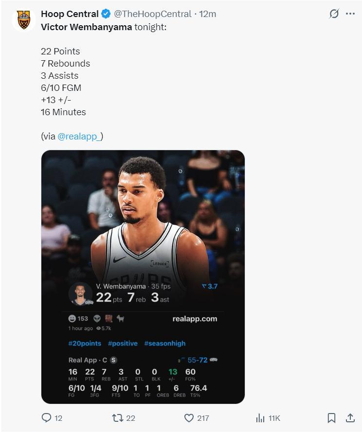 文班亞馬全場比賽16分鐘,10中6,三分4中1,罰球10中9,拿到22分7籃板3助攻1失誤,命中率60%,三分命中率25%,真實命中率76.4%,正負值+13。
