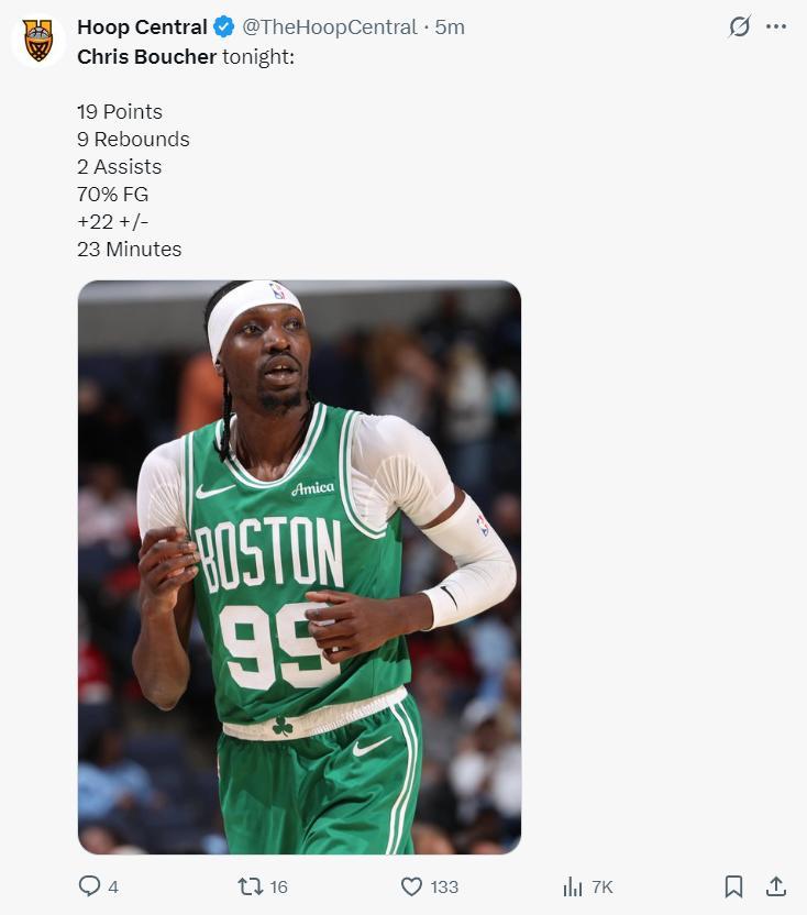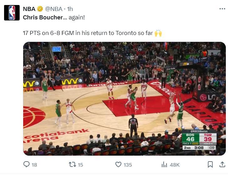 北京時間10月11日,NBA季前賽,波士頓凱爾特人以105-107惜敗多倫多猛龍。這場比賽是克里斯-布歇簽約綠凱後首次回到多倫多打比賽,此役布歇也絲毫沒有給老東家面子,半場17分,全場比賽23分鐘拿19+9非常高效。