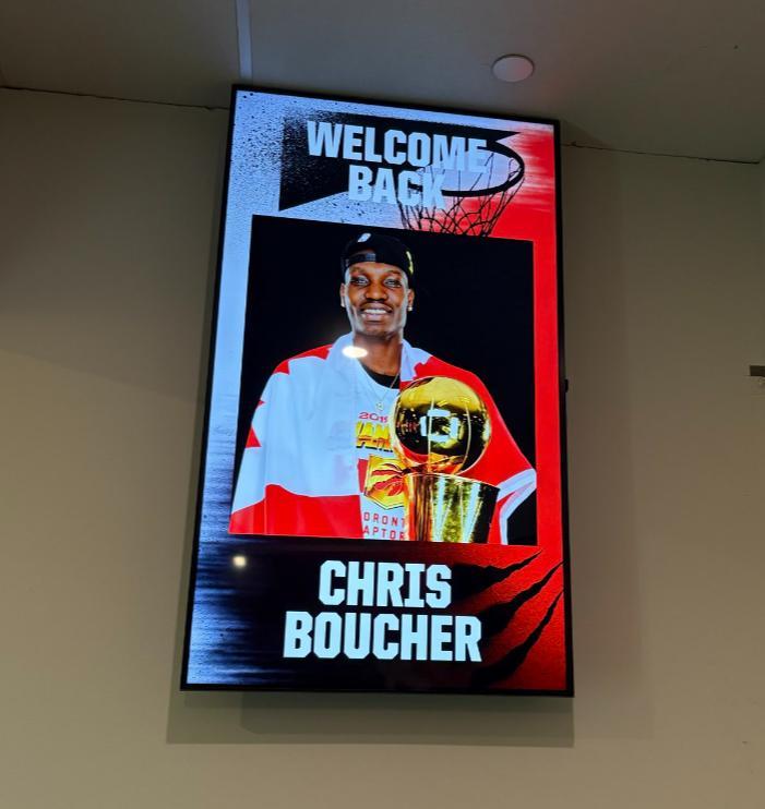 布歇是猛龍2019年奪冠的大功臣,猛龍主場爲了歡迎布歇重返多倫多也是花了一些心思,畢竟布歇已經在猛龍打了7個賽季。