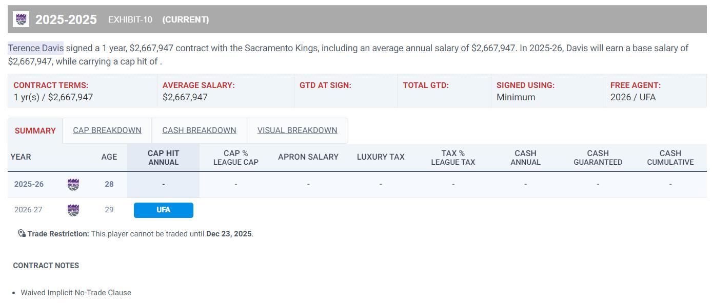 但我們會發現特倫斯-戴維森的合同細節很模糊,他並不是一份全額的保障性合同,國王隊也從未披露過他的合同細節,根據NBA記者肯尼-史密斯的報道,戴維森很可能跟國王簽下的是Exhibit10合同,國王可以在新賽季開啓前裁掉他,讓他去發展聯盟代表國王打球。