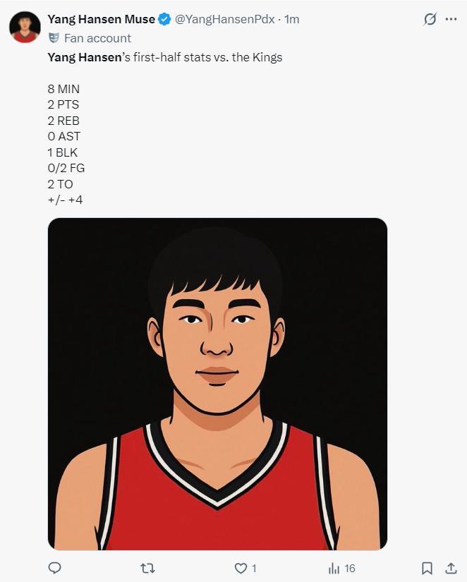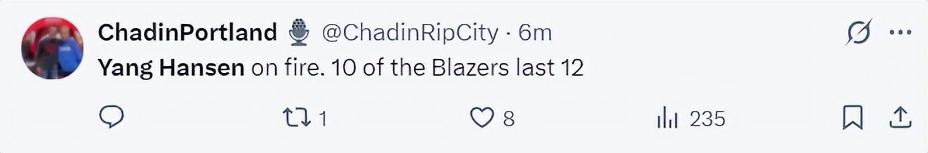 開拓者球迷:開拓者過去12分裏有10分是楊瀚森一人拿的。