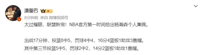 大V:太過耀眼了,楊瀚森成爲聯盟新寵,NBA官方第一時間就給出了楊瀚森個人集錦。