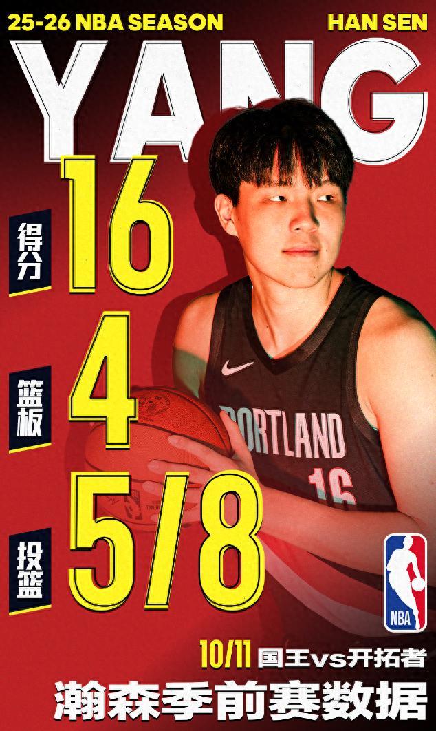 楊瀚森在開拓者主場完成了NBA季前賽的首秀,這場比賽的小楊一改客場首秀的膽怯、畏懼、青澀,他在第三節剛剛登場2分鐘就連拿10分,單節6分鐘裏5中5狂砍14分,他拿到了生涯首個季前賽兩雙數據。