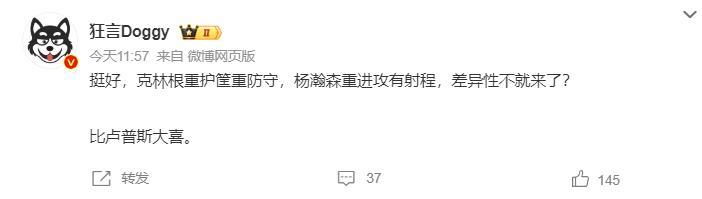 狂言Doggy:挺好,克林根注重護框防守,楊瀚森注重進攻有射程,這差異性不就來了? 比盧普斯大喜。