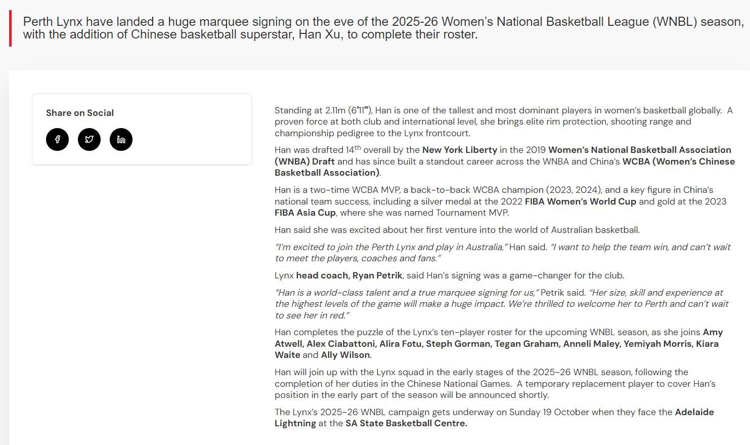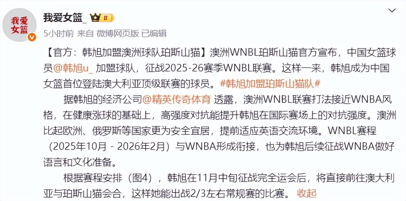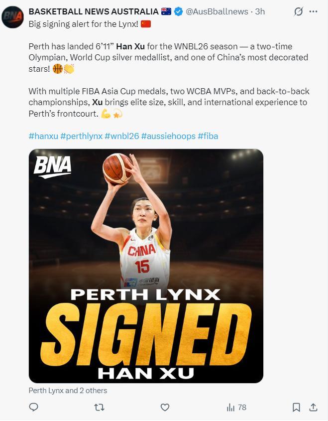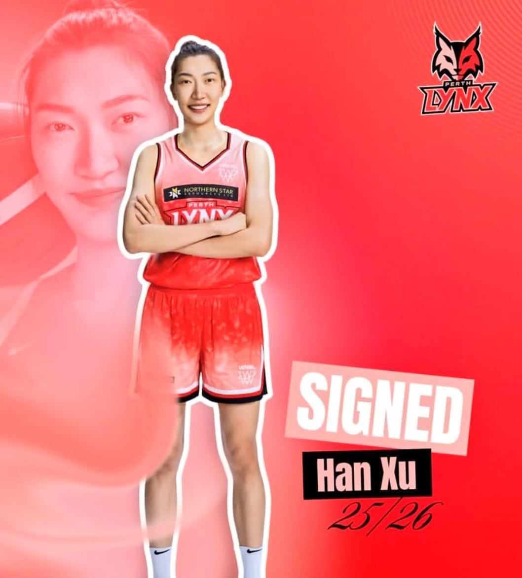 WNBL官方也歡迎韓旭加盟,WNBL寫道:珀斯山貓簽下了超級巨星,太令人震驚了,身高6尺11寸(2.10米)的中鋒將加盟山貓征戰WNBL。