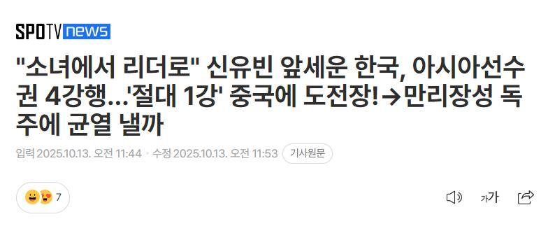文中寫道:韓國女團正在朝着亞洲巔峯進發,王牌申裕斌在1/4決賽中一人拿到2分幫助球隊擊敗中國香港隊進入四強至少獲得銅牌,四強對手是世界最強中國隊。