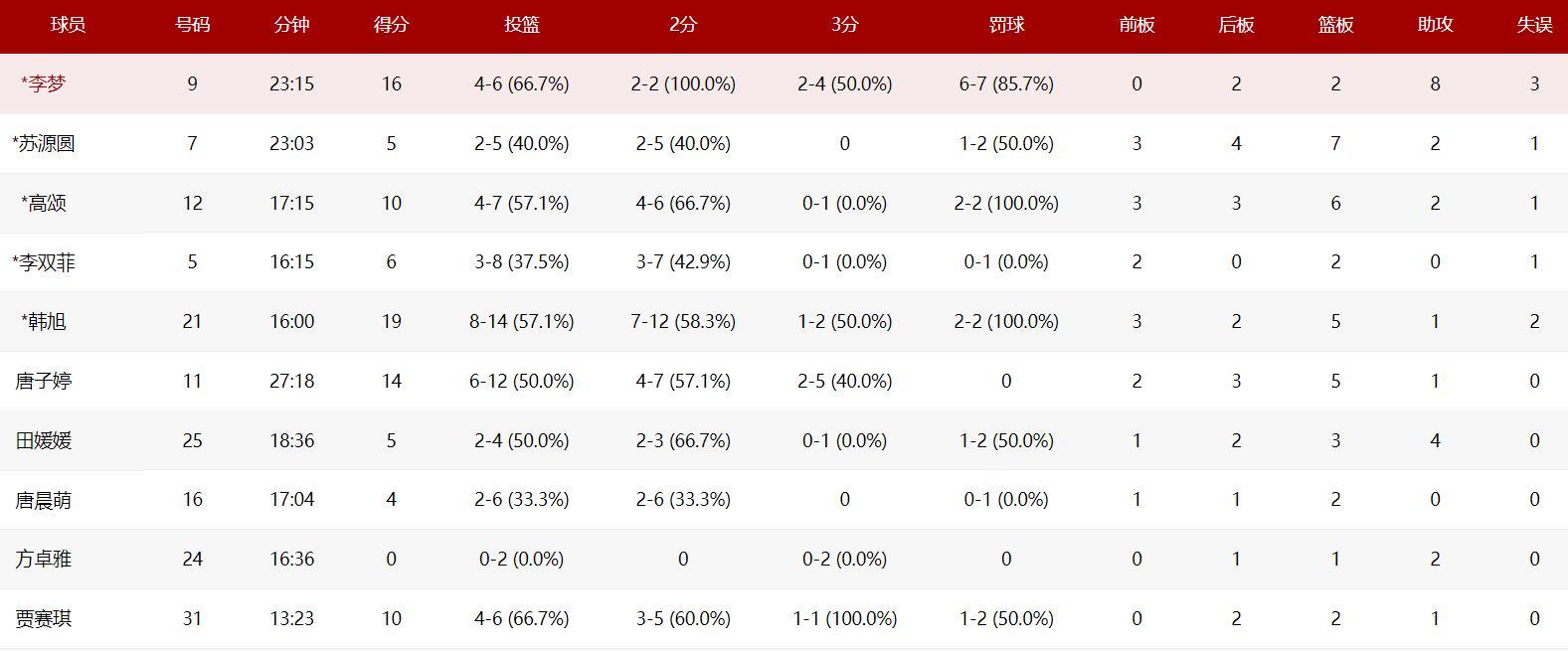 李夢依舊是國內第一檔的鋒線,在全運會資格賽階段她場均20分鐘, 拿到15分5.2助攻2.2籃板0.8搶斷,命中率63.4%,三分命中率25%,想要拿分的時候根本沒人可以擋住她。