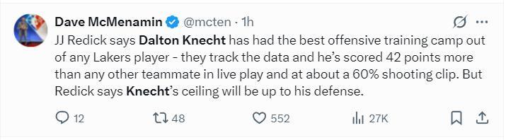 賽後雷迪克這樣評價克內克特:在所有的湖人球員中,克內克特實際上是訓練營進攻表現最出色的選手,球隊又數據追蹤,他在實戰中得分比其他隊友多42分,投籃命中率約60%,不過他的防守纔是提升他上限的關鍵。