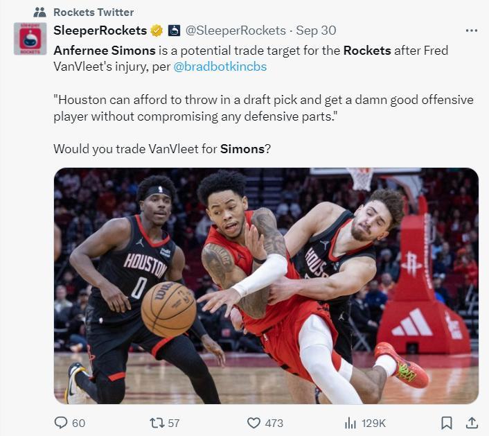 實際上早在9月30日,休媒Sleeper Rockets就透露,在弗雷德-範弗利特賽季報銷後,安芬尼-西蒙斯可能成爲火箭的引援目標。火箭隊完全可以拿出一個選秀權引進一位進攻組織類型的後衛,他的到來也不會影響到火箭防守端的配置,你們願意用範弗利特交易西蒙斯嗎?