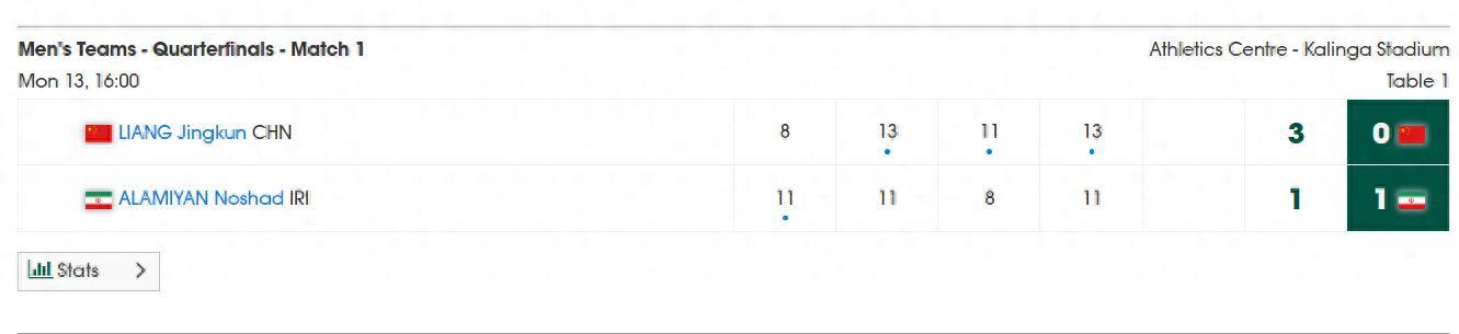阿拉米揚此前在奧洛穆茨支線賽拿到了男單冠軍,而且他與梁靖崑交手有二連勝優勢,他很敢出手,開場兩人打得有來有回 ,就是關鍵分的把握梁靖崑總是有些畏懼,阿拉米揚9-7領先,隨後梁靖崑穩定心神9-9扳平,阿拉米揚11-10局點,大胖11-11挽救局點,大胖12-11拿到局點,大胖13-11完成逆轉。