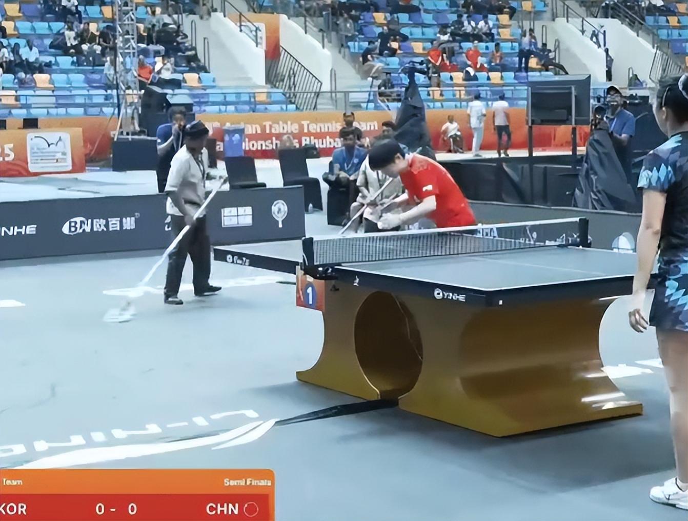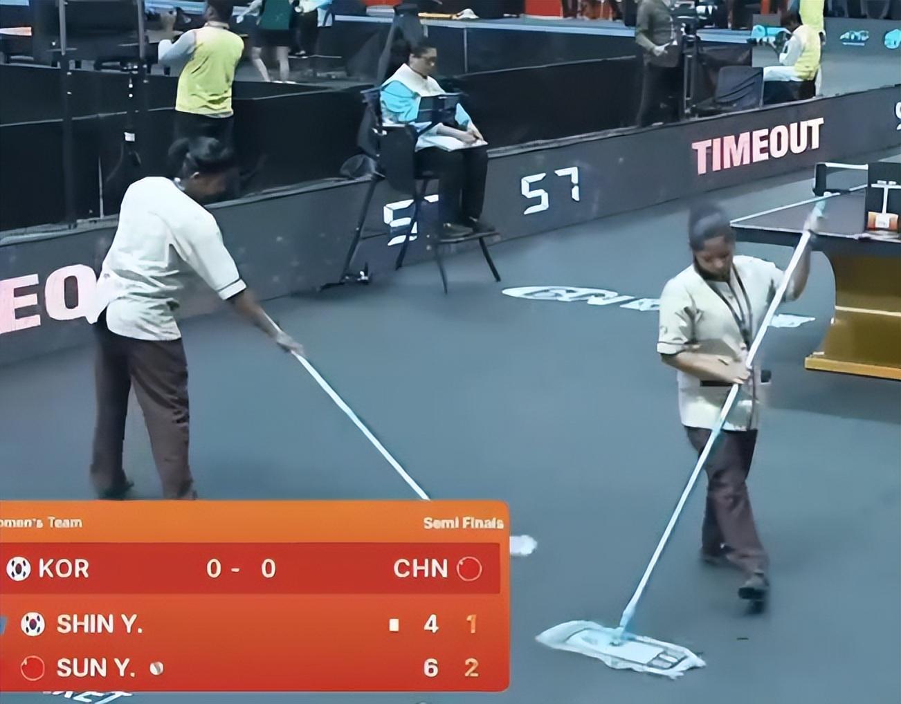 但這場比賽的小插曲很多,比賽剛剛開場孫穎莎就找到裁判說自己球檯的那邊有水印,隨後工作人員進場拖地。