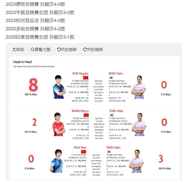 孫穎莎這場比賽擊敗申裕斌後,已經完成了在世界性大賽(不算商業賽)的5連勝,從2023年德班世乒賽開始孫穎莎就沒有輸過申裕斌:
