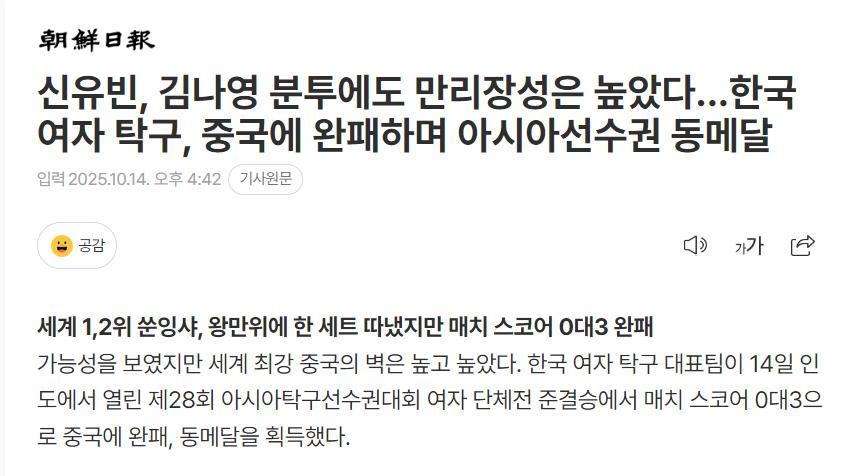 賽後韓國媒體《朝鮮日報》寫道:申裕斌、金娜英拼盡全力無奈中國長城太高,韓乒女團完敗國乒女團,最終獲得亞錦賽女團第三名。
