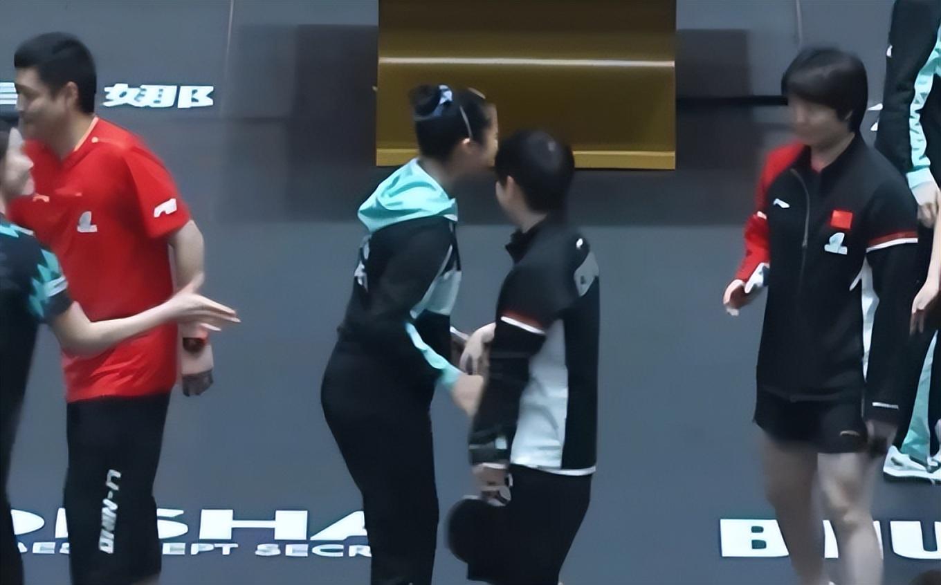 比賽結束後兩隊握手致意,我們能看到申裕斌一直面帶笑容,而且跟莎莎握手時她還故意摸了一下莎莎的肚子,兩位小姑娘的感覺是非常之好的,場上是對手場下就可以是朋友。