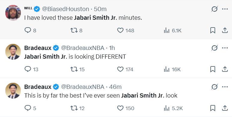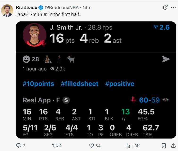 北京時間10月15日,NBA季前賽,火箭VS鵜鶘,這場比賽烏度卡出了奇陣,沒想到這套奇陣的第一箭頭不是凱文-杜蘭特也不是申京,而是小賈巴里-史密斯,他的投籃無比自信,他的持球犀利如刀,小賈如果能一直保持這樣的狀態,誰說火箭無法爭冠?