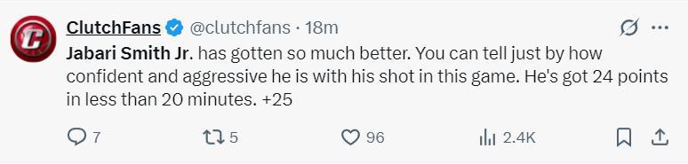休媒ClutchFans寫道:小賈的進步非常巨大,從這場比賽就能看出他的自信與積極態度,他在不到20分鐘就拿到24分,他在場+25。