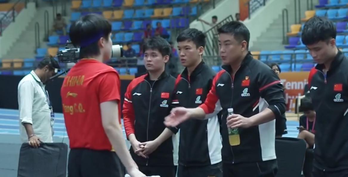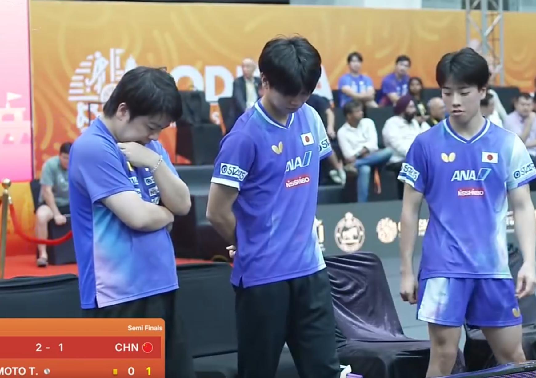 日乒2-1大比分領先,張本智和1-1王楚欽,第二局結束後日本替補席這邊沒有張本智和的身影,主帥帶着松島輝空、篠塚大登兩人傻傻站着,不知道張本智和跑到哪裏去了。