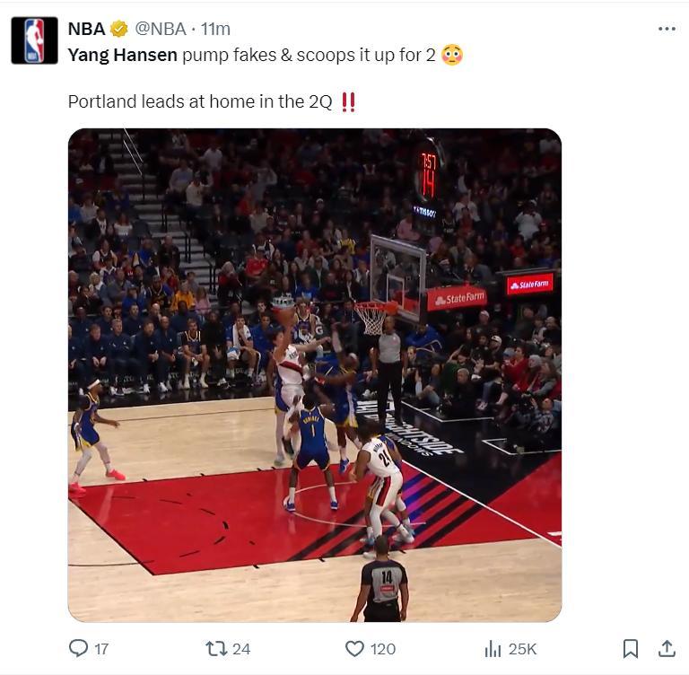 廣東媒體人麥穗豐:印象中楊瀚森在CBA幾乎沒這麼打過,去開拓者幾個月就學會了小前鋒打法,蹲底角+晃人+慢三步+低手上籃,在CBA會讓他這麼打嗎?去NBA取經有效。
