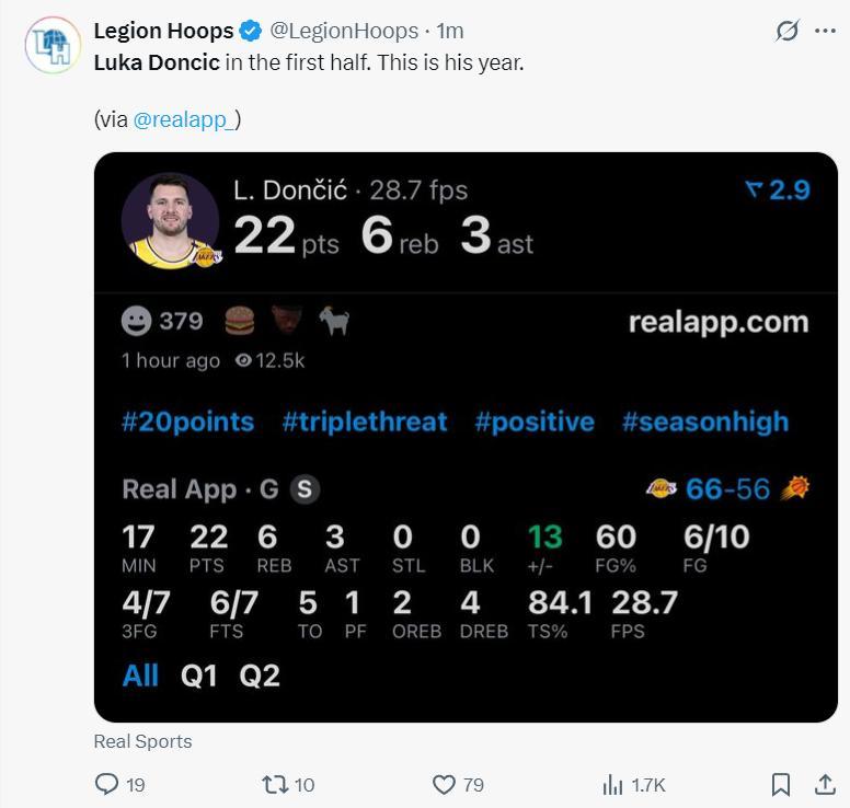 第二節東契奇6中3+三分5中3拿到12分2籃板1助攻,半場17分鐘,10中6+三分7中4,拿到22分6籃板3助攻,真實命中率84.1%,美媒LH:這一年會是東契奇豐收的一年。