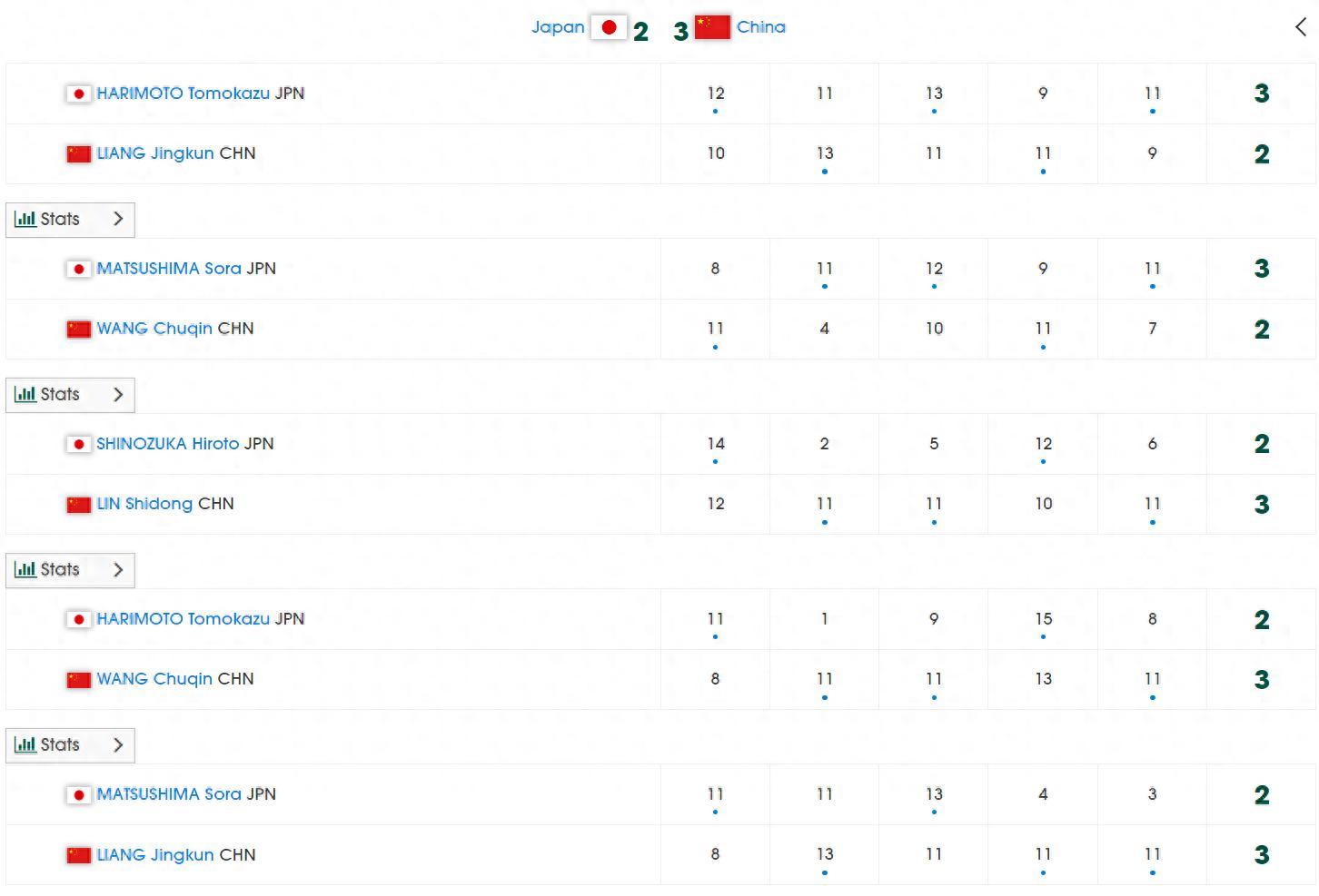 沒想到梁靖崑第四局11-4速勝,決勝局梁靖崑也沒有掉鏈子11-3直接打崩了松島輝空,松島輝空有一瞬間是仰天長嘆。梁靖崑3-2逆轉松島輝空:8-11、13-11、11-13、11-4、11-3。