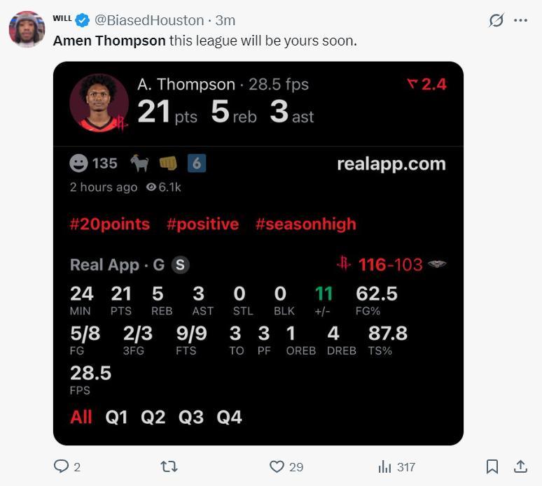 休媒BiasedHouston曬出阿門的數據寫道:再過不久他就可以統治聯盟了。(阿門季前賽三場11+3+2、19+7+6、21+5+3)